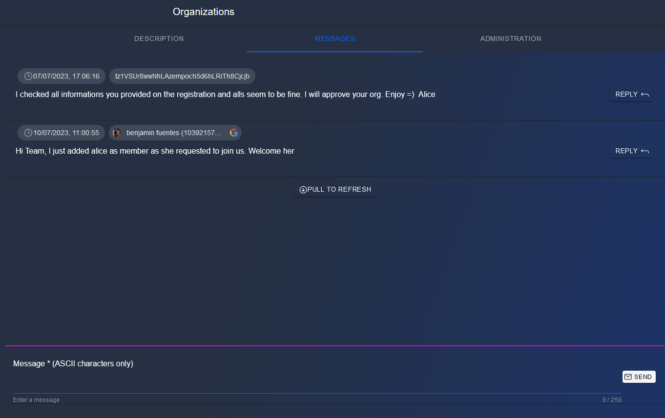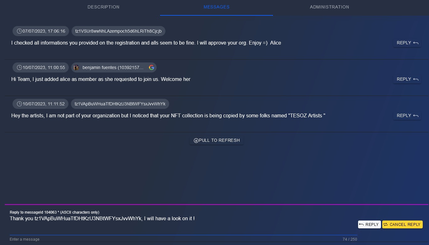 If someone send a message and is not part of the organization, he/she cannot see the answers. To tackle this issue, any user can decide to reply to a message.
